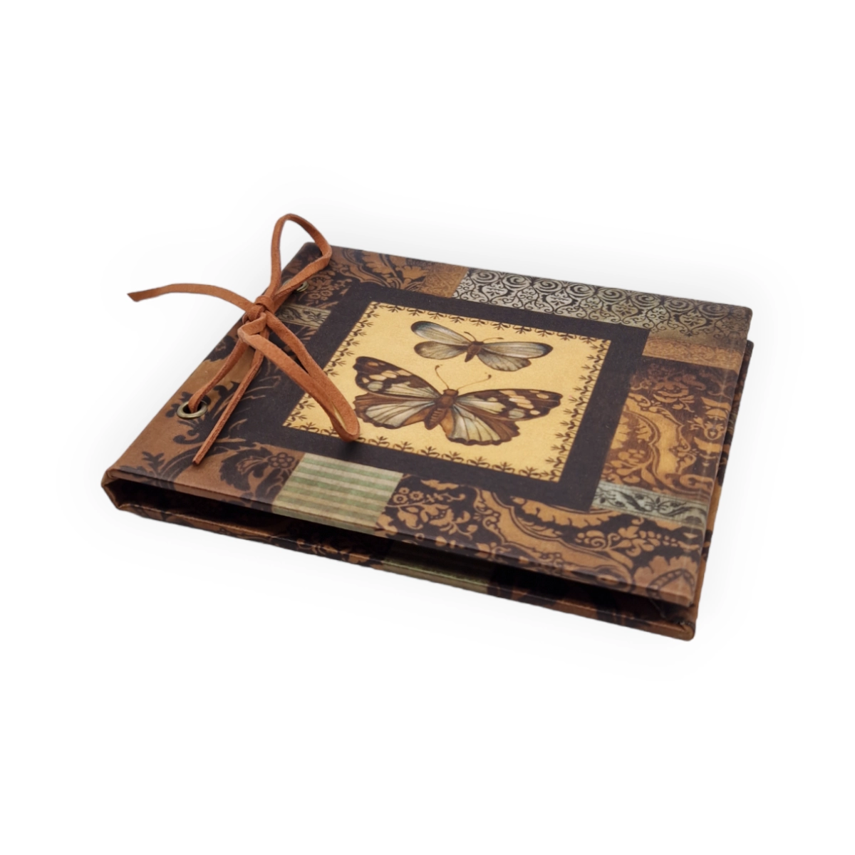 Anteckningsbok med hårt textilbeklätt omslag och en läderrem (går att knyta upp) som håller i pappret. Mått 16,5×12,5 cm.