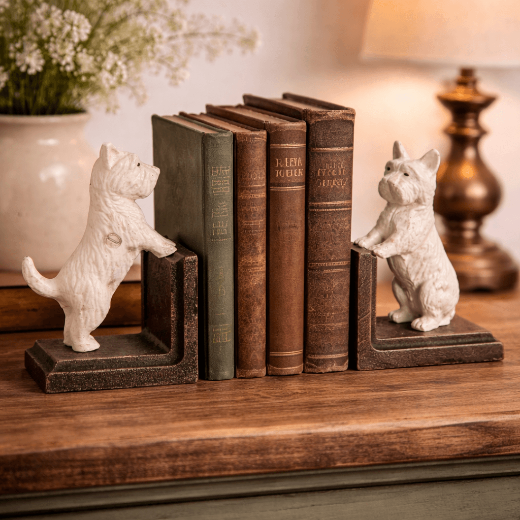 1-par bokstöd i gjutjärn med dekor av skotsk terrier, mått 15x8x10 cm.