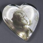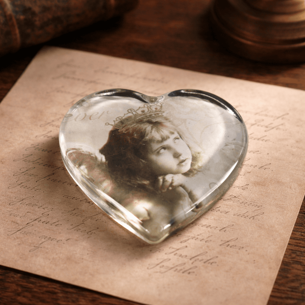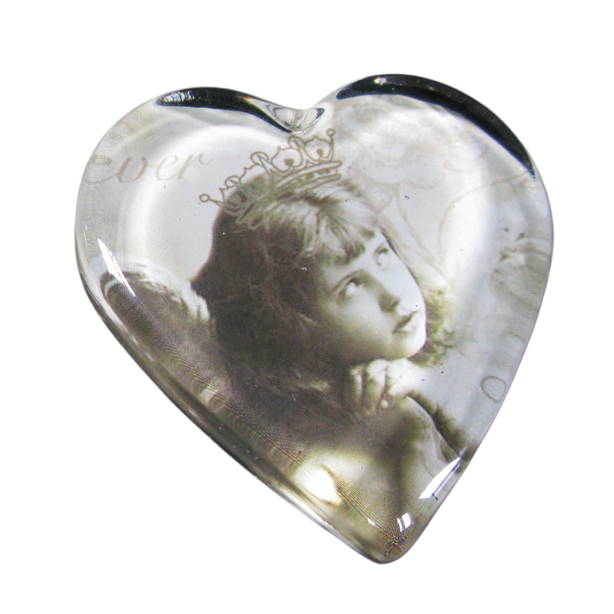 Hjärtformad brevpress i glas med svartvitt princessmotiv.
