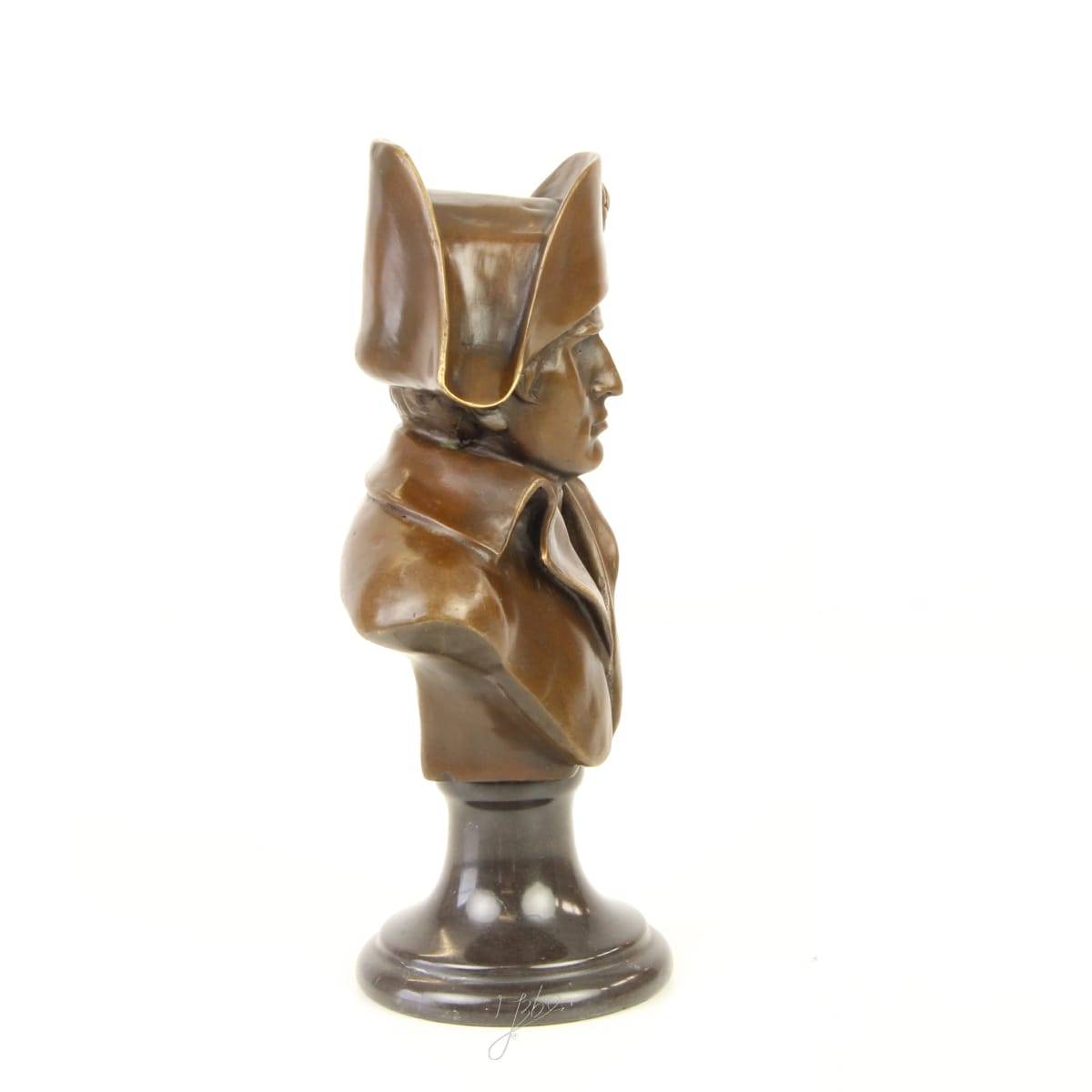 Dekorativ byst i brons med motiv av Napoleon, utformad med klassiska detaljer som ger ett uttryck med tydlig historisk karaktär. De markerade dragen och den välkända hatten gör den till en blickfångare som ger tyngd åt inredningen.