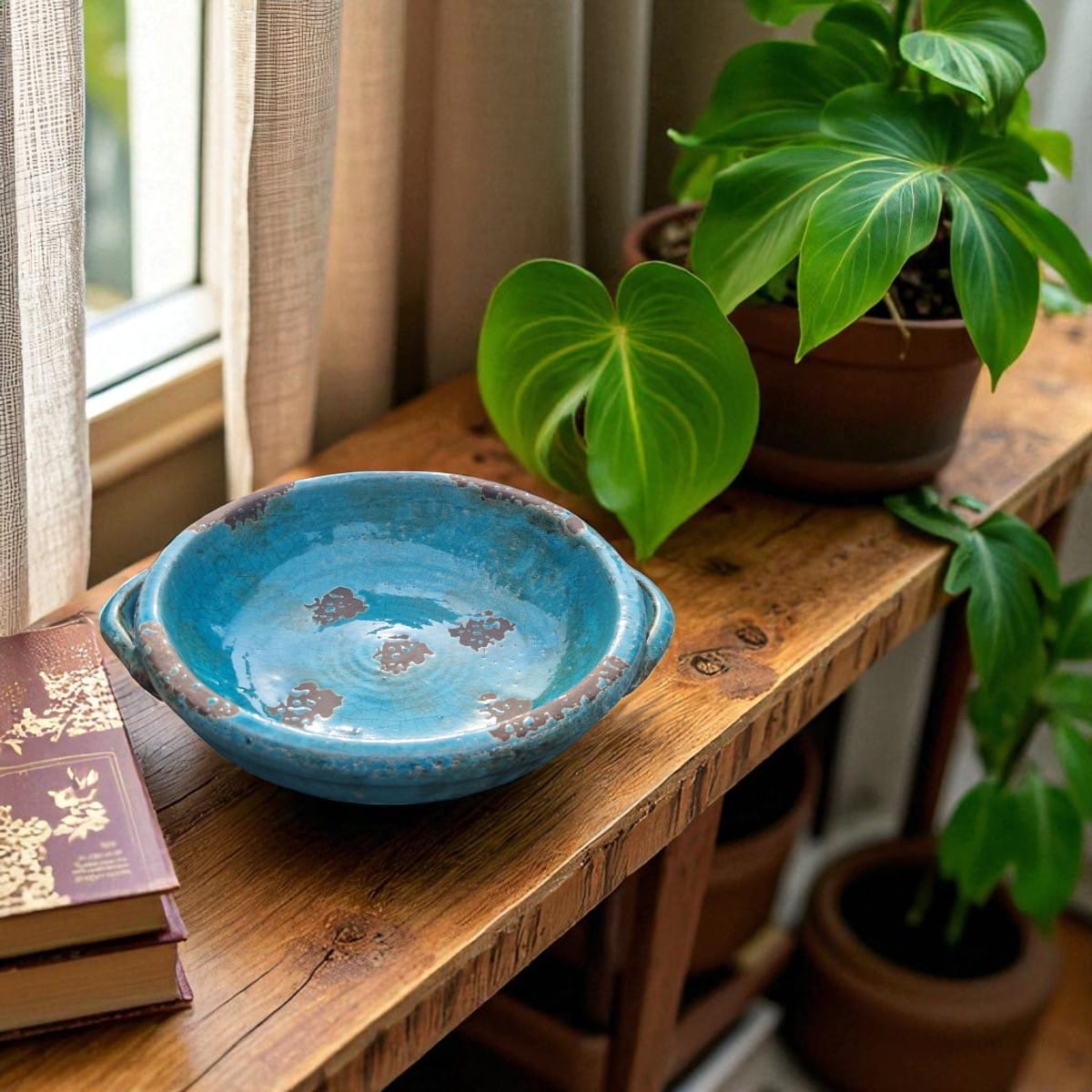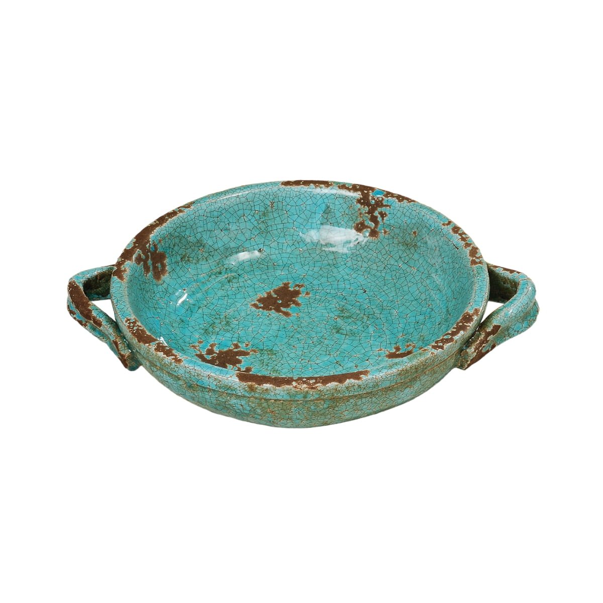 Stort keramikfat i vacker celadonfärg med patinerad yta. Fatet är tungt och har ett rustikt uttryck som passar perfekt som inredningsdetalj i ett vardagsrum. Använd det som bas för stilleben med blockljus, stenar eller torkade blommor, eller låt det stå för sig själv som ett konstnärligt blickfång.