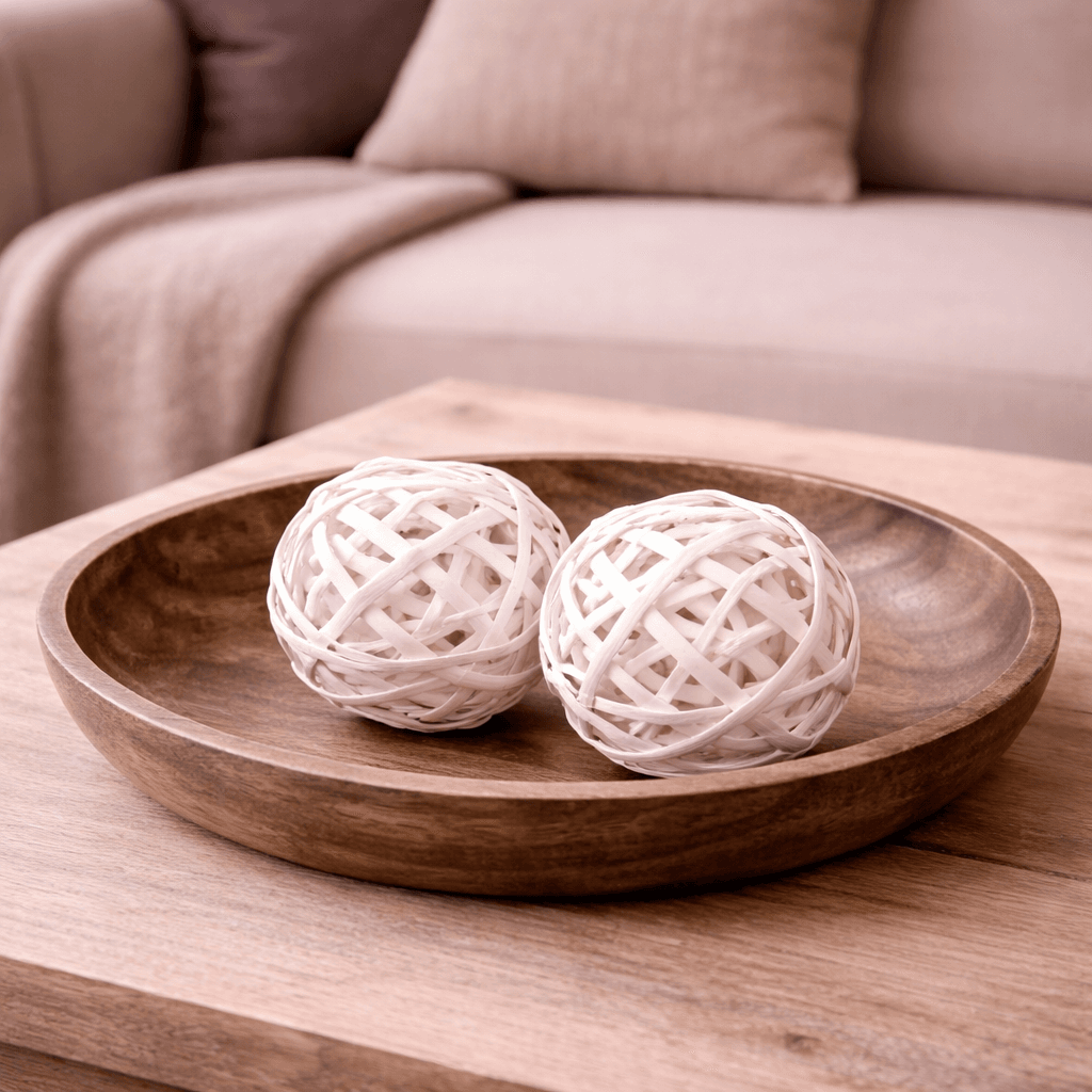 Dekorationsboll i naturmaterial med ett lätt och luftigt uttryck. Den flätade strukturen ger en fin kontrast mot släta ytor och tillför en mjuk känsla i inredningen. Passar fint i ett fat, en skål eller som en enkel detalj i ett stilleben.