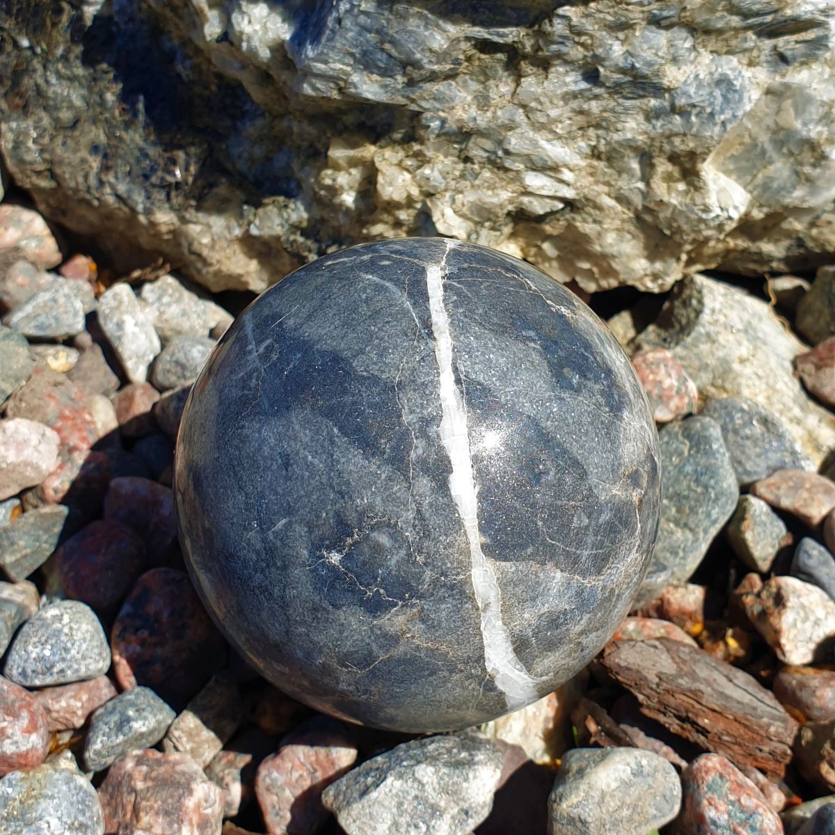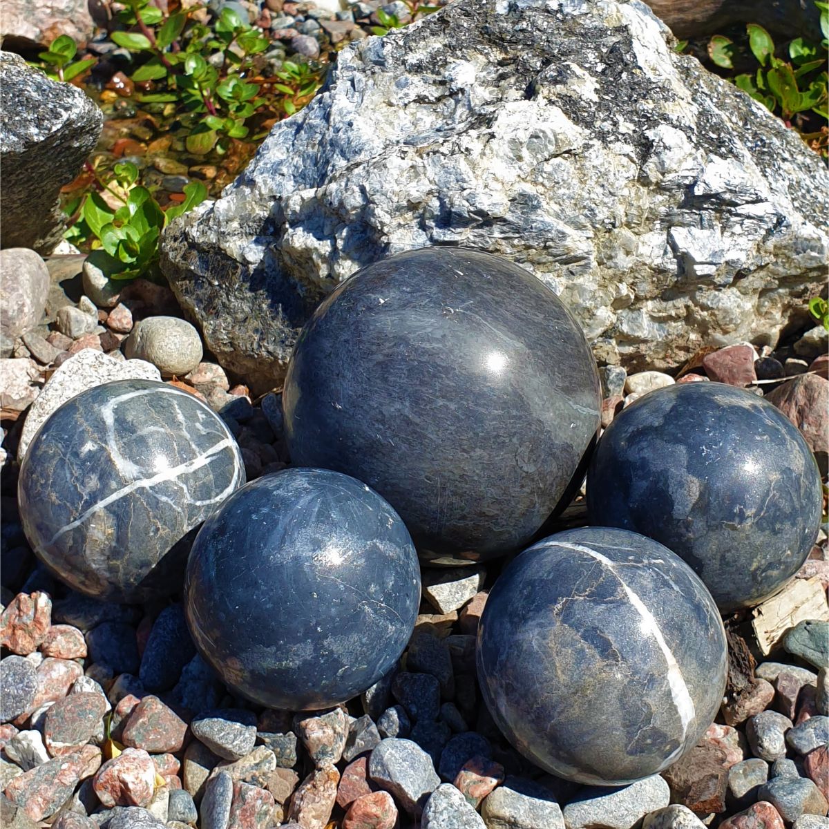 Dekorativt klot i marmor som ger ett lugnt och harmoniskt intryck, både i trädgården och inomhus. Den naturliga stenen skiftar i ton och mönster, från djupa mörka nyanser till varmare jordfärger, vilket gör varje klot unikt.