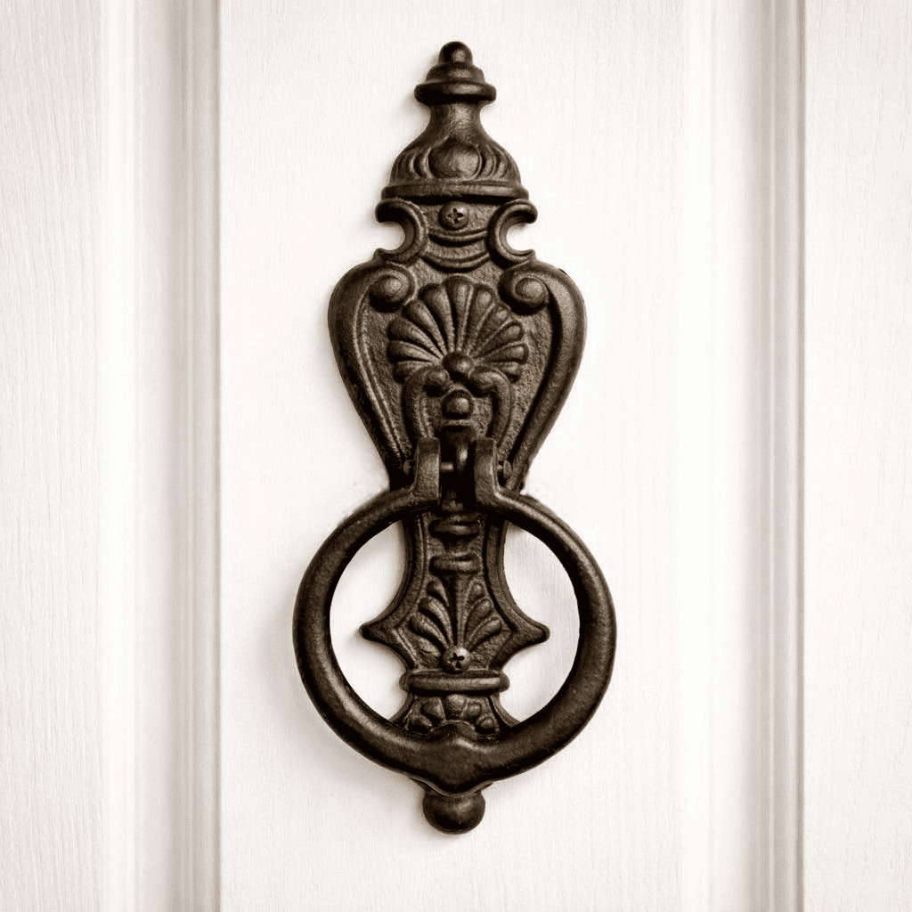 Dörrkläpp i robust gjutjärn med dekorativ form inspirerad av empirestil. Den gedigna känslan i materialet tillsammans med de klassiska detaljerna gör den till en både praktisk och vacker detalj på ytterdörren.