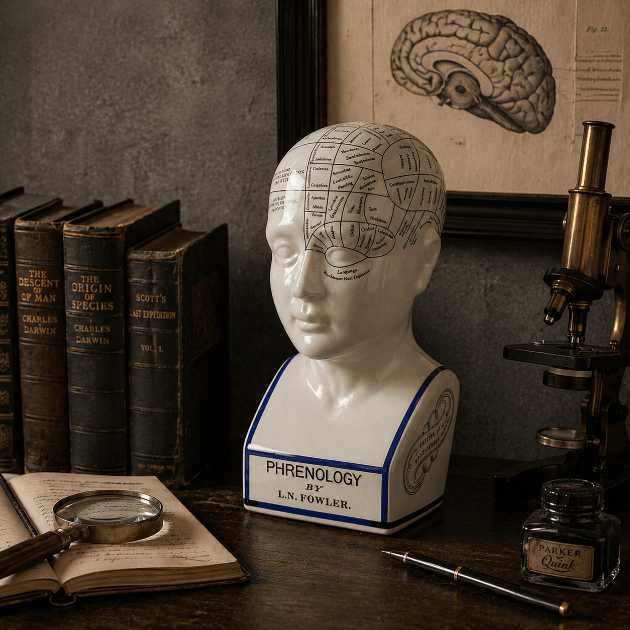 Dekorativt frenologihuvud i porslin med klassiska markeringar över huvudets olika områden. Frenologi var en idé från 1800-talet där man trodde att olika delar av personligheten kunde kopplas till olika delar av huvudet, och sådana här modeller användes som visuella hjälpmedel för att visa dessa indelningar.