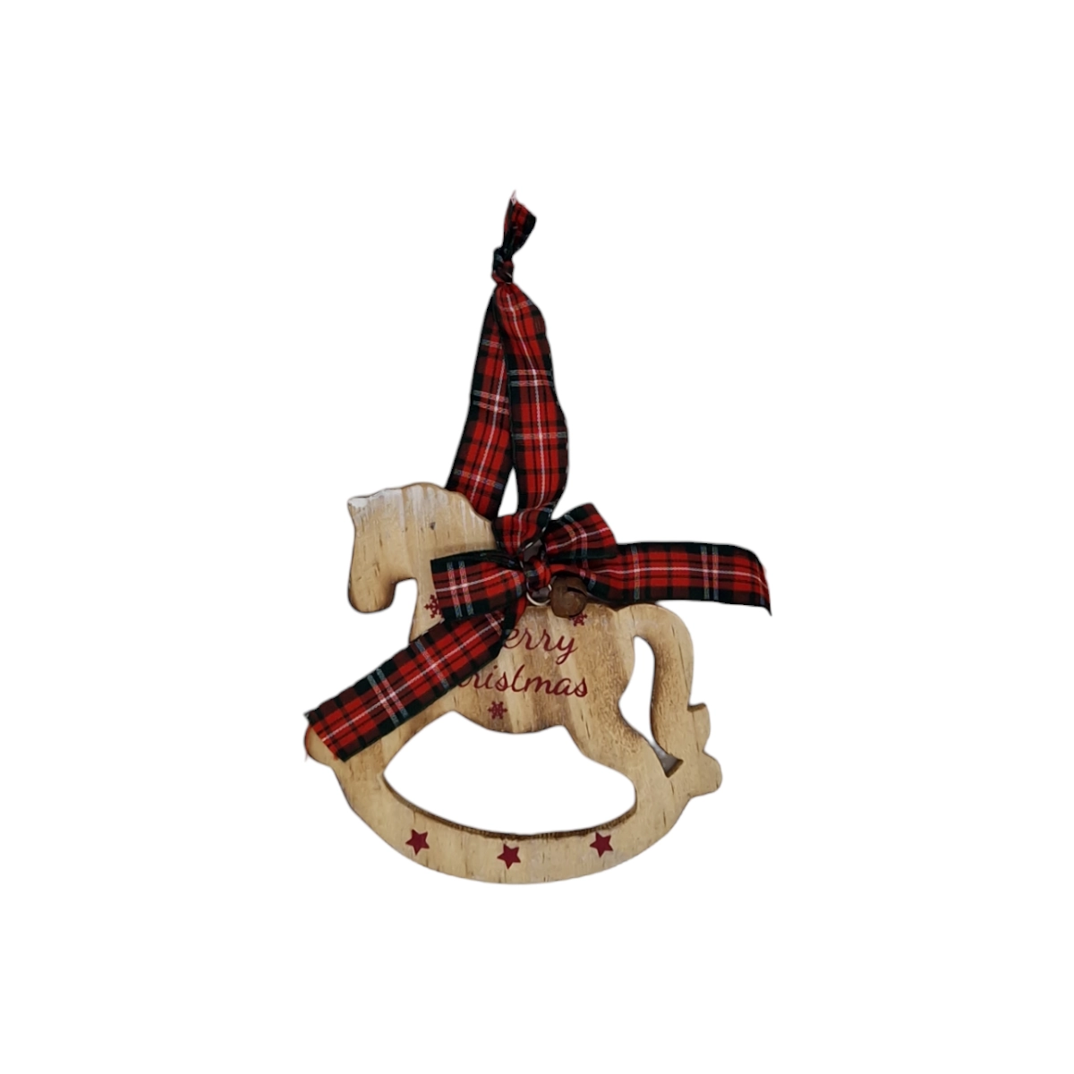 Hängdekoration i trä, gunghäst med textilband. Mått: 11,5x11x1 cm (hxbxd).