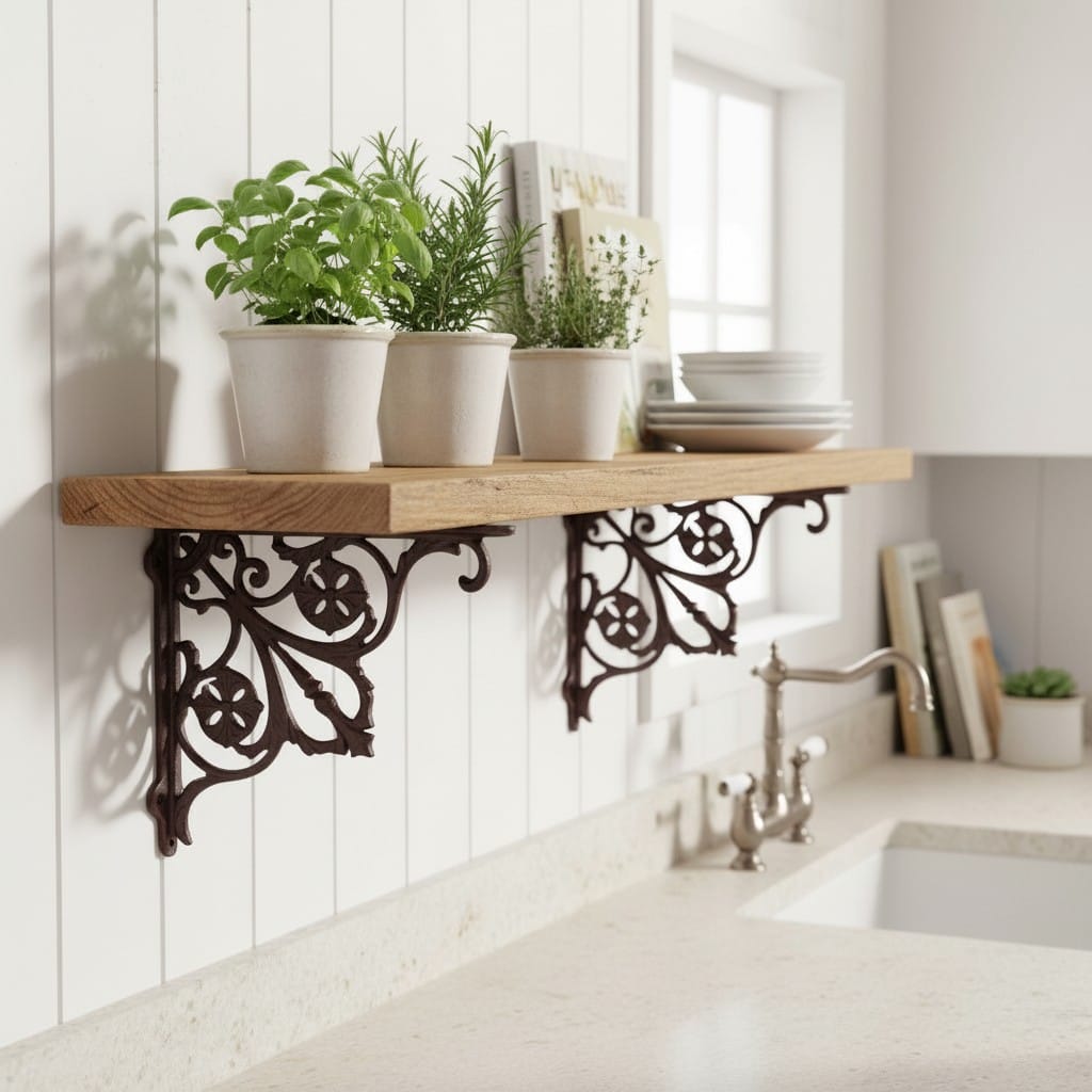 Dekorativ hyllkonsol i gjutjärn med klassiskt snirkligt mönster som ger ett levande och gediget uttryck. Den robusta konstruktionen gör den perfekt för hyllplan i kök, hall eller vardagsrum, där både funktion och form får ta plats.