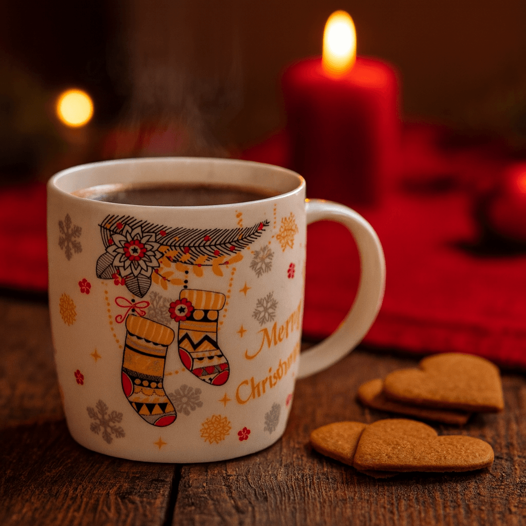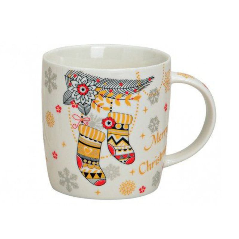 Julmugg i keramik med motiv av julstrumpor, snöflingor och texten Merry Christmas. Höjd 9 cm, perfekt för kaffe, te, varm choklad eller glögg under vinterns mysiga stunder.