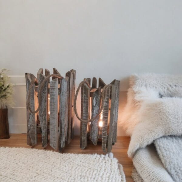 Grön ljuslykta i trä med glasbehållare och rephandtag. Diameter 12 cm, höjd 19 cm.
