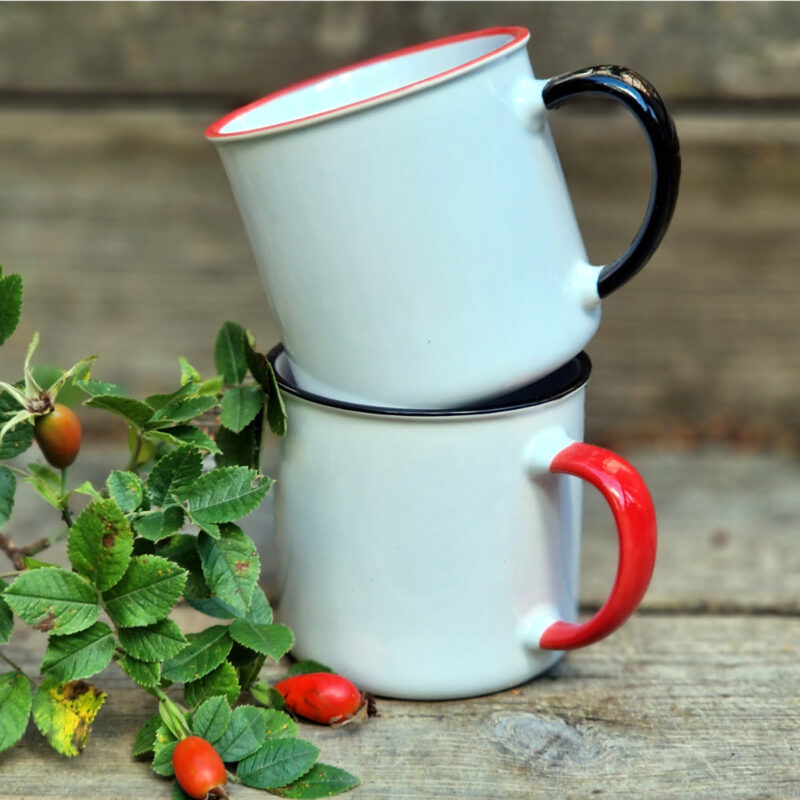 Mugg i vitt porslin med kant och handtag i kontrasterande färg. Designen påminner om den klassiska emaljmuggen, men denna är i porslin. Muggen är 8 cm hög och rymmer 320 ml. Maskindisksäker och kan värmas i micro.