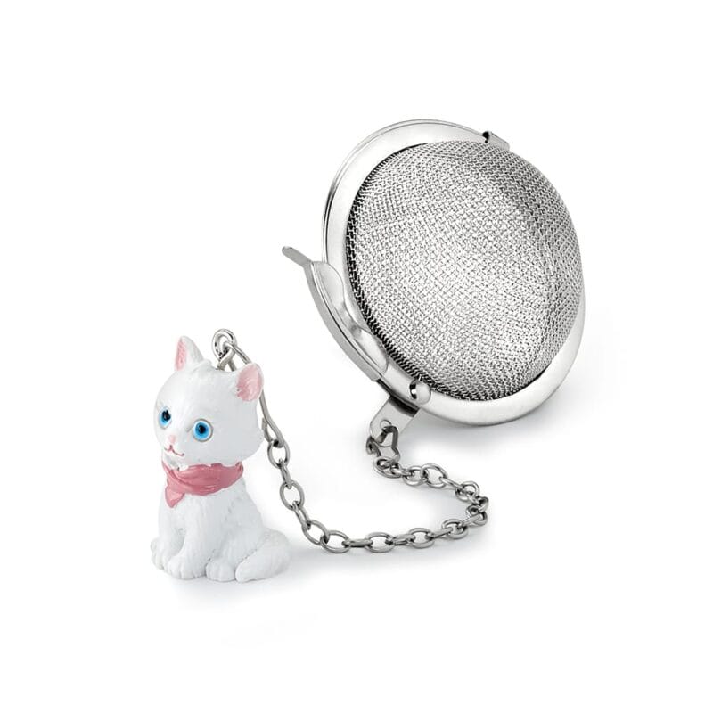 Kulformad tesil i rostfritt stål med en handmålad liten kattunge som ska hängas över kanten på koppen eller kannan. Halvorna hålls ihop med ett snäpplås som öppnas lätt vid påfyllning och rengöring. Diameter 5 cm.