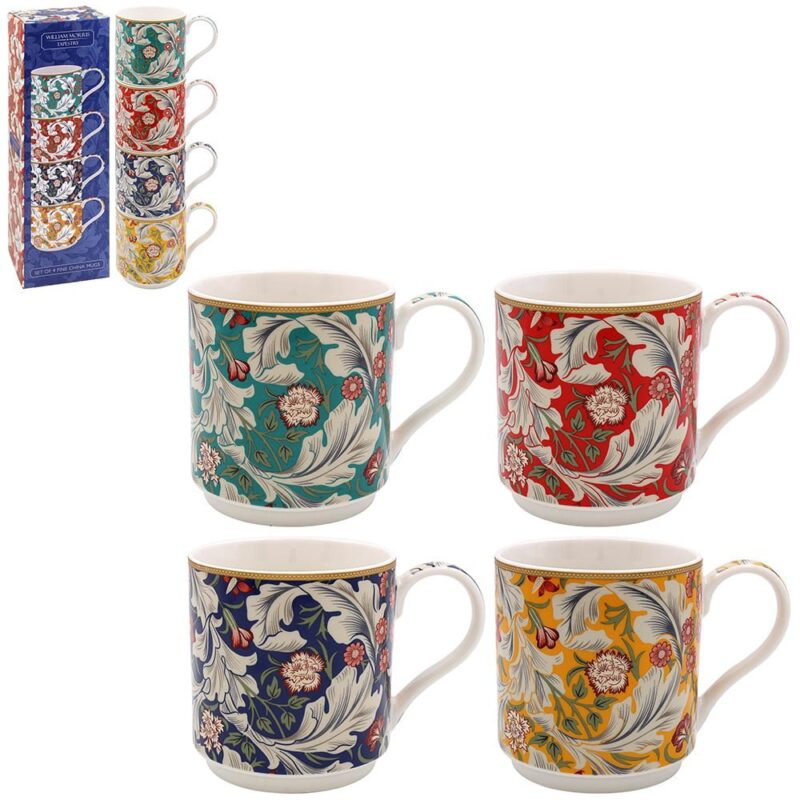Fyra porslinsmuggar med William Morrismönster i olika färger. Praktiskt formade för att vara stapelbara. Höjd 8,5 cm, diameter 8 cm. Tål mikro och diskmaskin. Förpackade i en fin ask.